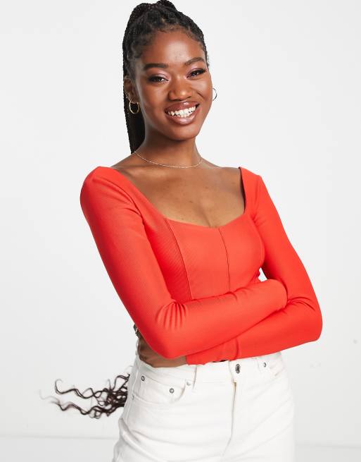 Stradivarius long sleeve structured rib corset top in red