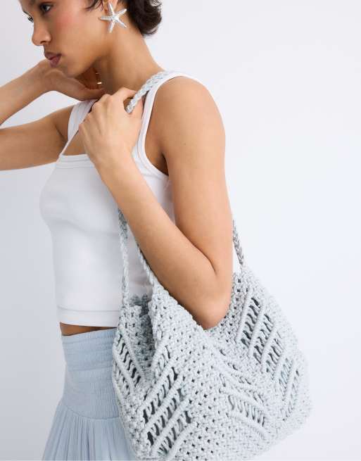 Stradivarius Metallic thread crochet shopper bag in grey
