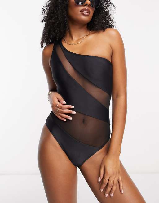 Stradivarius one shoulder swimsuit with mesh detail in black
