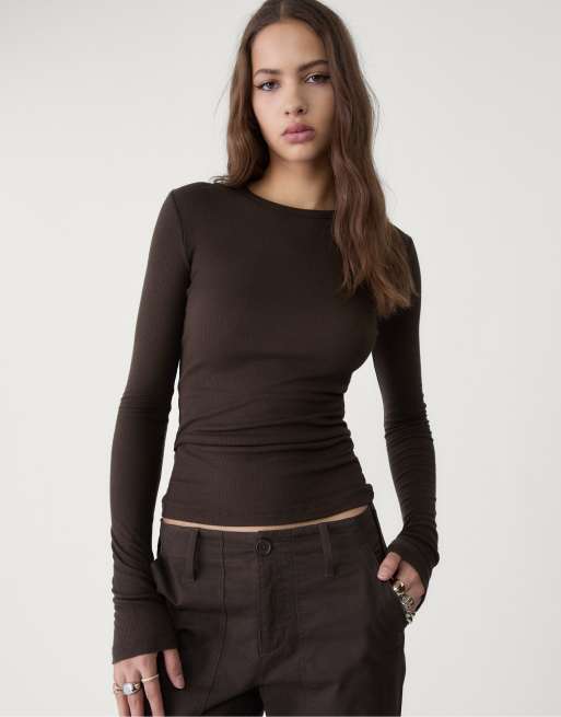 Stradivarius Ribbed long sleeve t-shirt in brown
