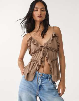 Stradivarius ruffled strappy top in brown