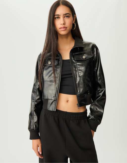 Stradivarius Short leather effect jacket with buttons in black