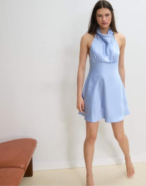 Stradivarius Short satin halter dress in sky blue