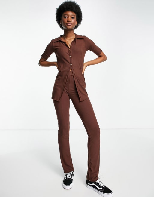 Stradivarius short sleeve button detail polo and ribbed trouser co-ord in brown
