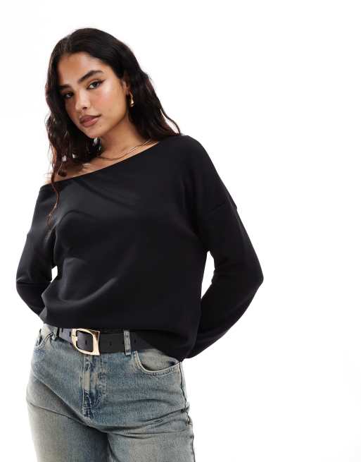 Stradivarius soft touch exposed shoulder sweatshirt in black