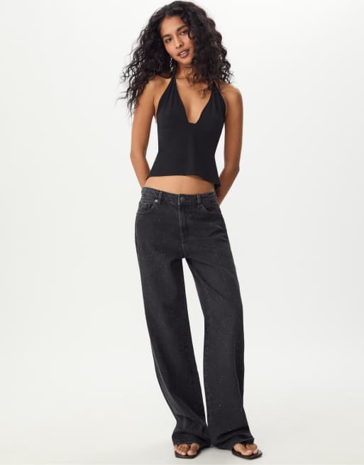 Stradivarius Straight-fit jeans with rhinestones in black denim washed effect