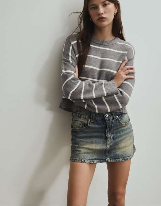 Stradivarius Striped cropped knit sweater in dark grey