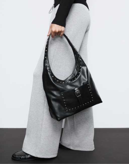 Stradivarius Studded shoulder bag in black