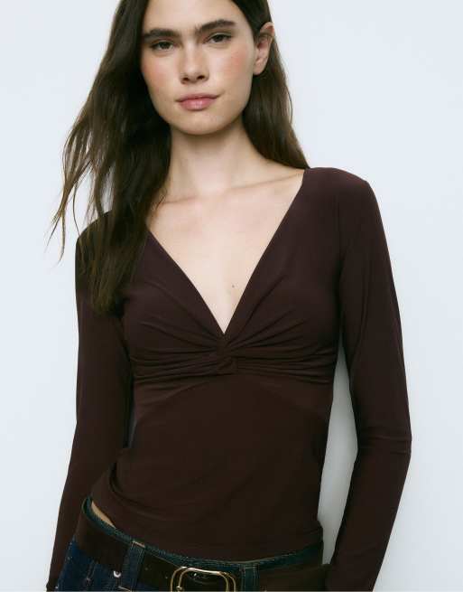 Stradivarius T-shirt with knotted neckline in brown