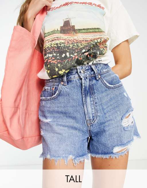 Stradivarius Tall denim short with rips in medium blue wash