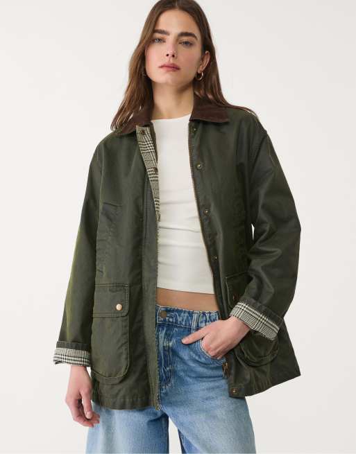 Stradivarius Waxed parka with multiple pockets in khaki