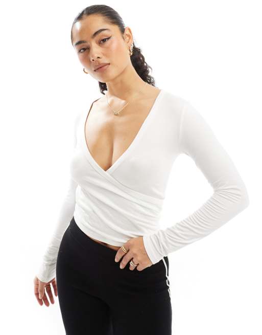 Stradivarius wrap detail long sleeve top in white