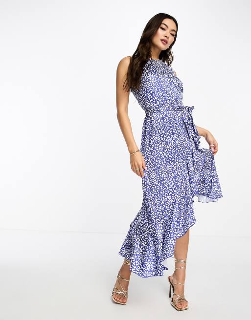 Style Cheat ruffle wrap midi dress in cobalt spot print