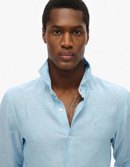 Superdry Embroidered vacation linen shirt in sea blue chambray