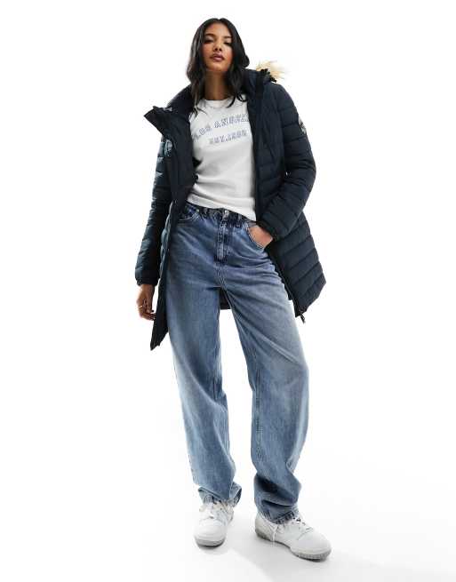 Superdry Fuji hooded mid length puffer coat in nordic chrome navy