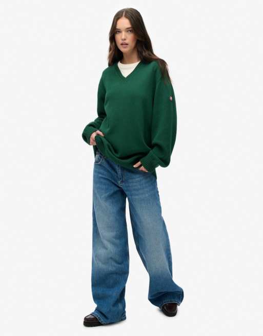 Superdry Oversized v neck jumper in dark green