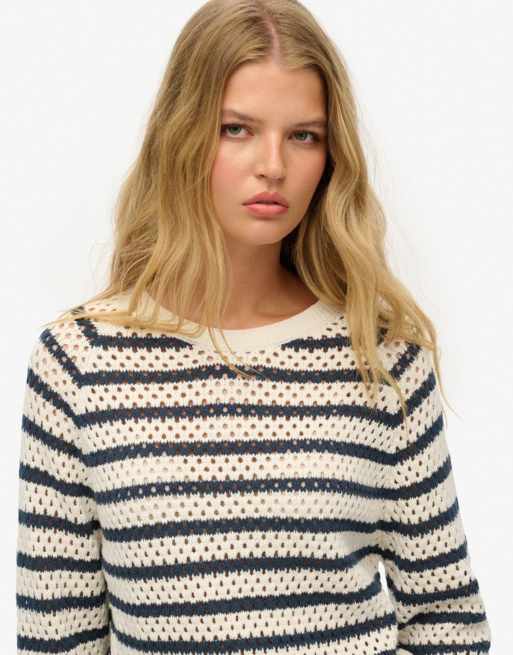 Superdry Stripe crochet slouchy crew jumper in natural white stripe