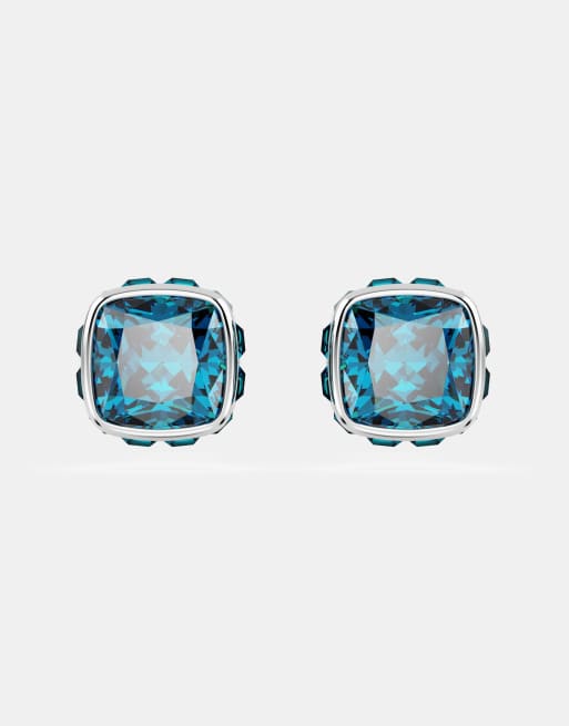 Swarovski Birthstone stud earrings, square cut, september, blue, rhodium plated in blue