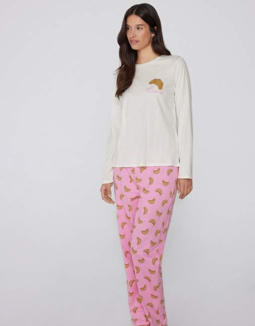 Tezenis Croissant patch long cotton pyjamas in ivory milk and croissant patch