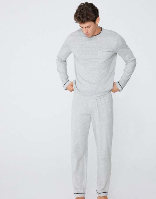 Tezenis Men’s long piping cotton pyjamas in mottled light grey