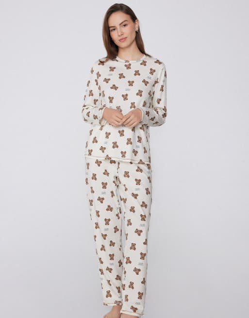 Tezenis Teddy bear print long cotton pyjamas in milk teddy bear print