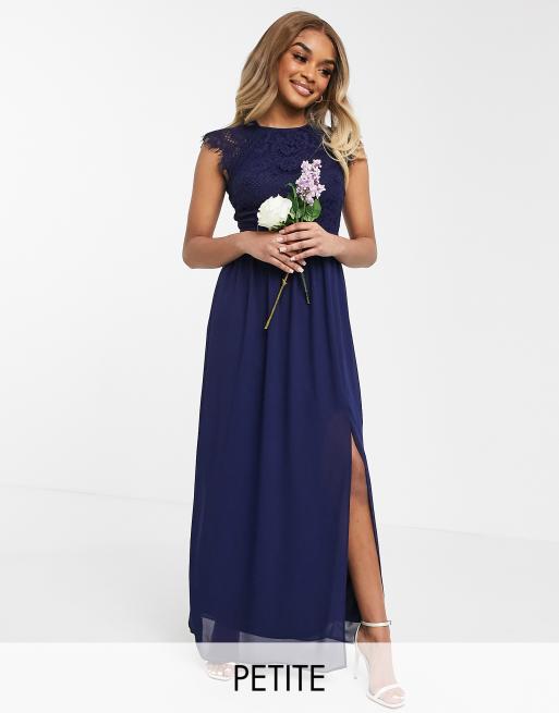 TFNC Petite bridesmaid lace open back maxi dress in navy