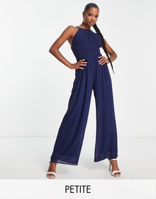 TFNC Petite Bridesmaid pleated halter neck wide leg jumpsuit in navy