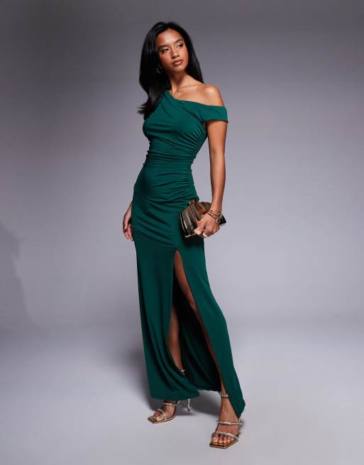 TFNC Petite one shoulder midaxi dress with thigh split in emerald