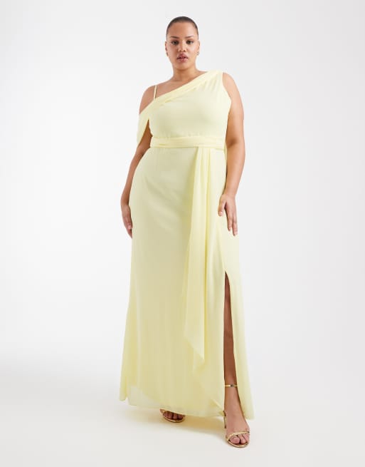 TFNC Plus Bridesmaid chiffon fallen shoulder scarf drape detail maxi dress in lemon