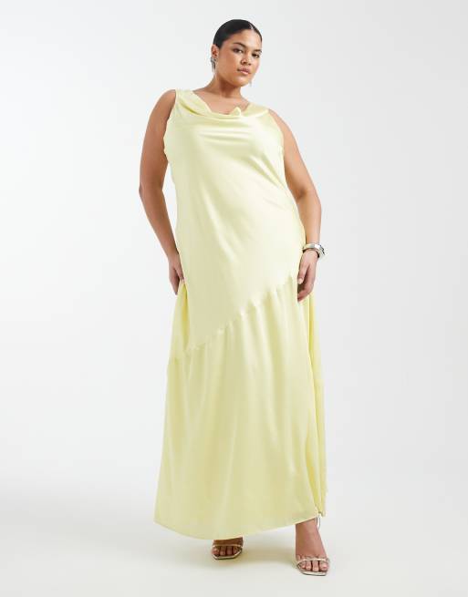TFNC Plus Bridesmaid satin cowl front and back maxi dress in butter lemon