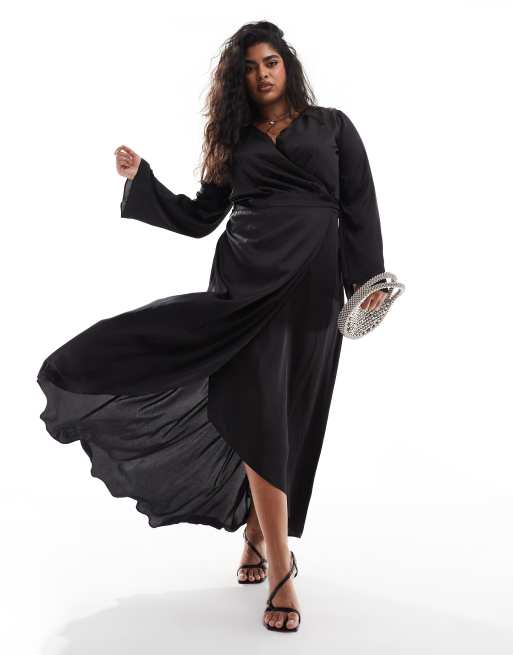 TFNC Plus satin long sleeve wrap maxi dress in black