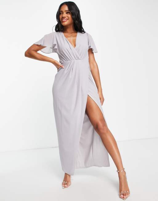 TFNC Bridesmaid chiffon wrap front maxi dress with flutter sleeve in grey