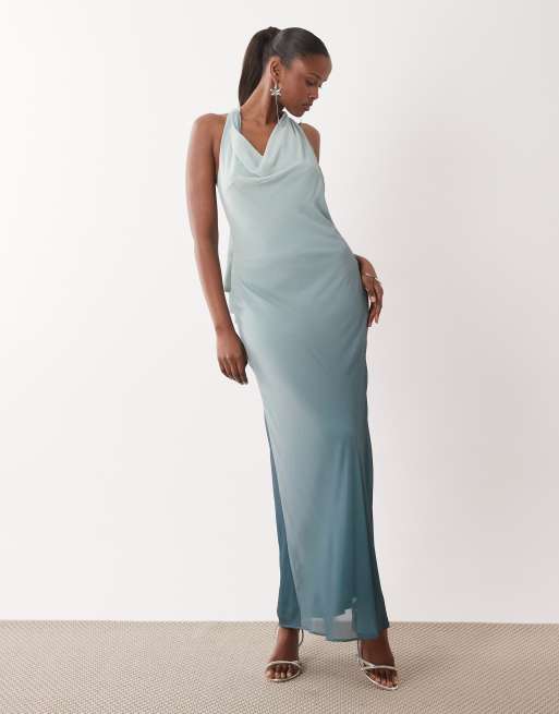 TFNC Bridesmaids halter neck chiffon maxi dress in aqua ombre