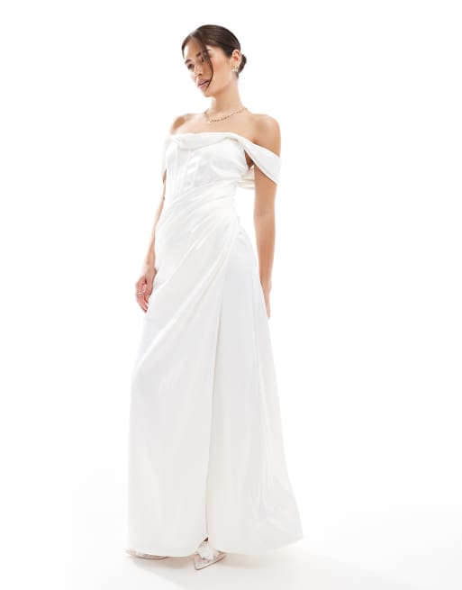 TFNC drop shoulder satin corset maxi dress in white