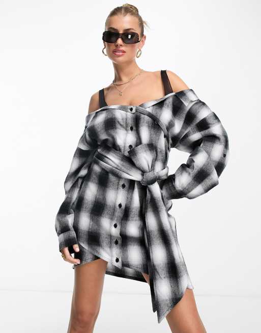 The Couture Club off shoulder button front dress in black check