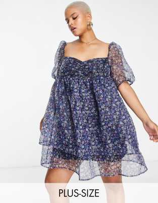 The Frolic Plus puff sleeve organza mini dress in bloom floral