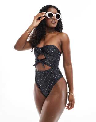 The Frolic exclusive bandeau knot front cut out detail swimsuit in black polka dot