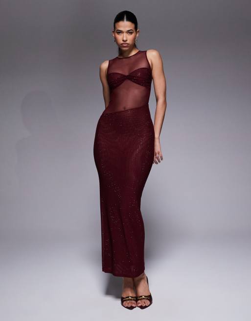 The Frolic exclusive high neck sleeveless hot fix sheer insert maxi dress in burgundy