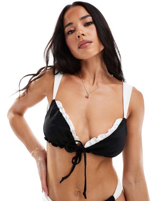 The Frolic exclusive ruched ruffle tie front contrast bikini top and bottoms co-ord in mono