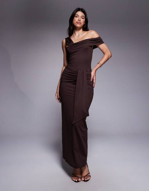 The Frolic exclusive slinky bardot drape detail maxi dress in chocolate