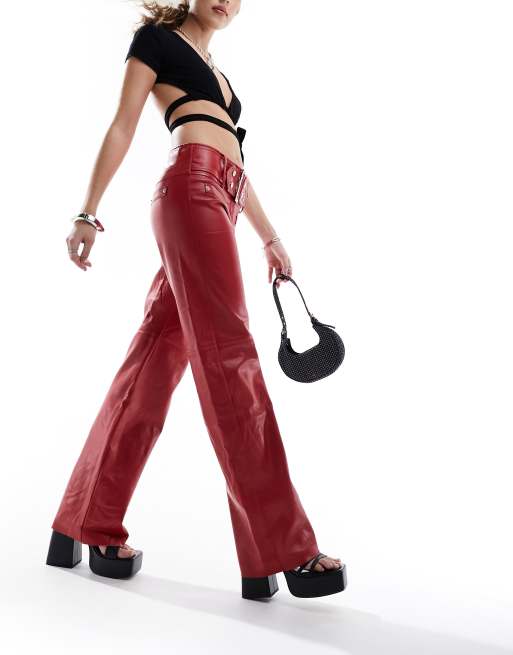 The Kript Y2K low rise trousers in red faux leather with silver belt detail