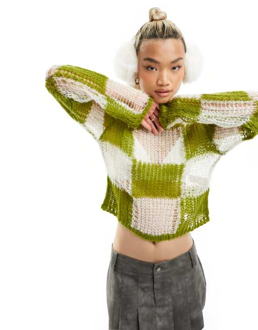 The Ragged Priest checkerboard open knit jumper in green