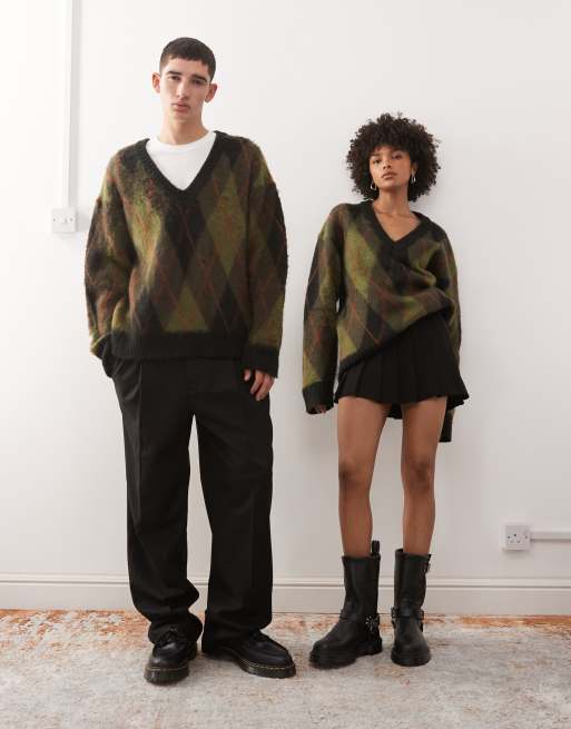 The Ragged Priest unisex argyle fuzzy v neck jumper in green