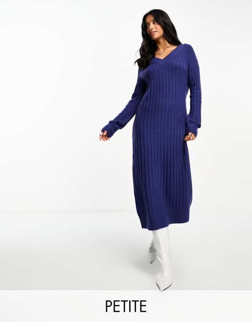 Threadbare Petite Bella v neck ribbed midi jumper dress in navy