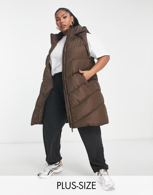 Threadbare Plus Vamp longline padded gilet with hood in chocolate brown