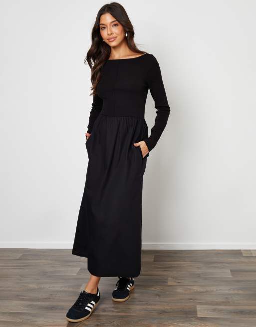 Threadbare 2-in-1 jersey poplin mix slash neck long sleeve dress in black
