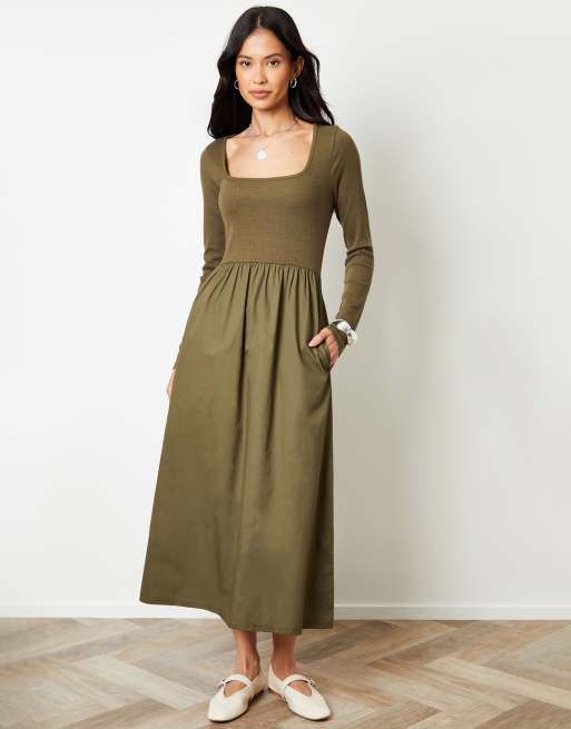 Threadbare 2-in-1 jersey poplin mix square neck long sleeve dress in khaki