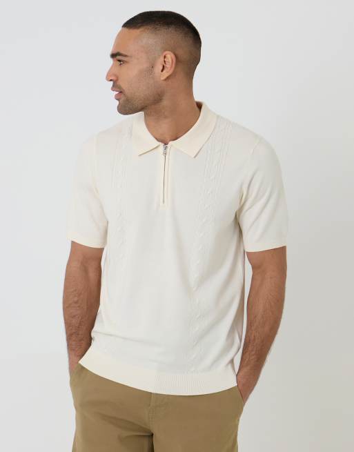Threadbare Cable knit quarter zip polo in natural