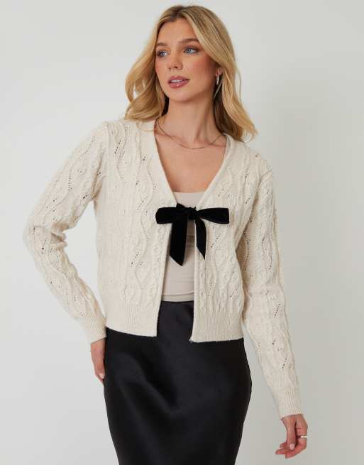 Threadbare Cable knit velvet bow detail cardigan in cream