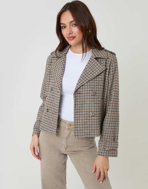 Threadbare Check faux wool cropped jacket in brown